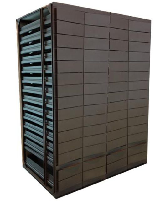 Każda kolumna z szufladami jest zbudowana jako jeden blok, wykonany całkowicie ze stali i pokryty lakierem, dzięki czemu cechuje ją duża odporność na zużycie. Kolumny są łatwe w instalacji oraz konserwacji . Dzięki łożyskom pokrytym nylonem, szuflady poruszają się w łatwy i bezszelestny sposób. Wysuwane podpory – stanowią ułatwienie w dostępie do najwyższych szuflad. Wysokość kolumny: 207 cm, głębokość szuflad: 125 cm, szerokość – 45 cm Front: podstawowy kolor - szary lub dowolny inny wybrany przez klienta Cena: 5900 zł netto za kolumnę.