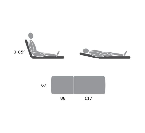Wysokiej klasy, dwuczęściowy stół do badań i zabiegów z długą sekcją zagłówka, regulowaną za pomocą sprężyny gazowej w zakresie od 0 do 80 stopni (możliwość uzystaknia pozycji siedzącej), o wymiarach 205cm x 67cm, na 4 antypoślizgowych stopach. Regulacja wysokości leżyska w zakresie od 47cm do 100cm. możliwość zamontawania uchwytu na ręcznik od strony podnóżka lub zagłówka. Dzięki prześwitowi ramy (15 cm) istnieje możliwość podjechania do stołu podnośnikiem dla pacjenta.