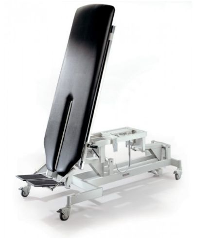 Tilting Advanced jest to jednoczęściowy stół do pionizacji z elektryczną regulacją kąta nachylenia i wysokośći za pomocą pilota zaopatrzony w dwa siłowniki. Dzielony, osobno regulowany podnóżek, 4 koła z blokadą, wskaźnik wychylenia.