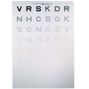 Tablica do badania wrażliwości na kontrast widzenia Pelli-Robson firmy Haag-Streit. W zestawie dwie tablice badania, dwa formularze wynikowe, cztery uchwyty do tablic. Tablice są wykonane z trwałych elementów plastikowych, litery na tablicy są zaznaczone przy pomocy specjalnego atramentu. Na tablicy wszystkie litery są jednej wielkości, ale w miarę przesuwania sie w dół tablicy-bledną. Wyposażenie dodatkowe: zestaw 50 arkuszy wynikowych badania.