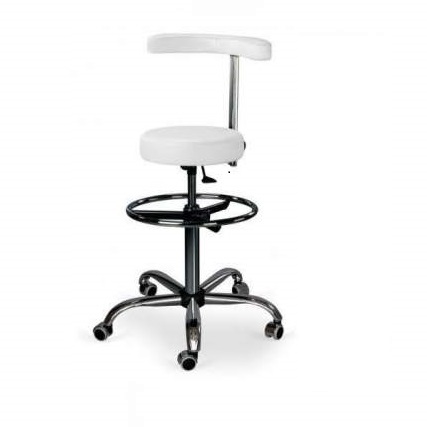 Taboret Polo - to elegancki i wygodny taboret o chromowanej konstrukcji, wyposażony w podnóżek, podłokietnik i kółka. Idealnie sprawdza się w gabinetach stomatologicznych. Solidna konstrukcja i podnóżek z regulacją wysokości umożliwiają przyjęcie pewnej i stabilnej pozycji podczas zabiegu. Komfortowy podłokietnik zapewnia wygodne wsparcie ręki podczas pracy, a podgumowane kółka pozwalają płynnie przemieszczać się wokół pacjenta. Sprężyna gazowa służąca do regulacji wysokości, nogi o atrakcyjnym, wygiętym kształcie oraz osłony kółek są chromowane, co nadaje taboretowi ma nowoczesny i atrakcyjny wygląd.