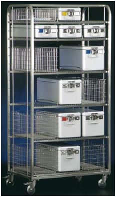 Regał transportowy EG STE z półkami z siatki, o pojemności do 12 koszy do materiałów sterylnych 1 STE i 6 koszy 1/2 STE. Konstrukcja z rurki stalowej o przekroju kwadratu (25 × 25 mm), solidnie spawana, pozbawiona ostrych krawędzi. Regał standardowo wyposażony jest w jedną półkę montowaną na stałe i pięć półek z możliwością regulacji pionowej co 88 mm. Pozbawione ostrych krawędzi półki wykonano z siatki ze STALI NIERDZEWNEJ. 4 antystatyczne kółka obrotowe (2 z blokadą), Ř 125 mm.