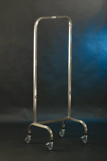 Wózek hakowy- jednostronny. STAL NIERDZEWNA, material 1.4301. Konstrukcja z rurki stalowej o przekroju kwadratu (25 x 25 mm) z przyspawanymi hakami do zawieszenia 4 koszy. Dopuszczalne obciążenie haków: 60kg na hak. 4 odporne na ścieranie, korozję, antystatyczne. Kółka obrotowe (2 z blokadą) o średnicy 75 mm ze zderzakami w formie krążka. Odległość między hakami: 320 mm. Wymiary: 610 x 470 x 1600 mm (szer./ gł. / wys.)