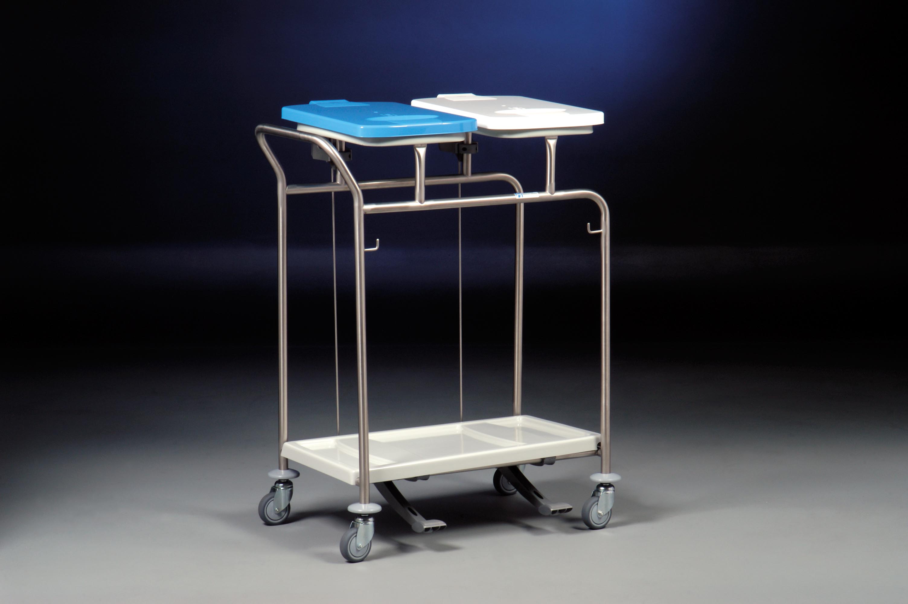 Podwójny zbieracz odpadów, z 2 opatentowanymi obręczami HR 2000 do zamocowania worków (obręcz wyposażona jest w kołnierz gumowy zawijany do góry, dzięki czemu worek nie zsuwa się z obręczy, aby zdjąć worek ze zbieracza wystarczy pociągnąć brzeg worka do dołu), z wytrzymałymi pokrywami wykonanymi z ABS, otwieranymi za pomocą mechanizmu pedału, z mechanizmem tłumienia hałasu przy zamykaniu pokrywy (mechanizm spowalniający opadanie pokrywy), dostępne kolory pokryw: biały, żółty, czerwony, zielony, niebieski, brązowy, szary, czarny, zbieracz wyposażony w wyjmowaną dolną półkę z ABS w kolorze jasnoszarym zabezpieczającą podłogi przed zabrudzeniem, konstrukcja zbieracza wykonana ze stali nierdzewnej, solidnie spawana, pozbawiona śrub i ostrych krawędzi, dodatkowy haczyk stalowy, 4 kółka obrotowe o średnicy 75 mm ze zderzakami w formie krążków, dostępne również inne kółka, wymiary: 750 x 485 x 950 mm (szer./gł./wys.)