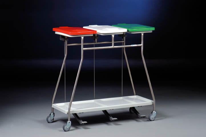 Potrójny zbieracz odpadów, z 3 opatentowanymi obręczami HR 2000 do zamocowania worków (obręcz wyposażona jest w kołnierz gumowy zawijany do góry, dzięki czemu worek nie zsuwa się z obręczy, aby zdjąć worek ze zbieracza wystarczy pociągnąć brzeg worka do dołu), z wytrzymałymi pokrywami wykonanymi z ABS, otwieranymi za pomocą mechanizmu pedału, dostępne kolory pokryw: biały, żółty, czerwony, zielony, niebieski, brązowy, szary, czarny, zbieracz wyposażony w wyjmowaną dolną półkę z ABS w kolorze jasnoszarym zabezpieczającą podłogi przed zabrudzeniem, konstrukcja zbieracza wykonana ze stali nierdzewnej, solidnie spawana, pozbawiona śrub i ostrych krawędzi, 4 kółka obrotowe o średnicy 75 mm, dostępne również inne kółka, wymiary: 1000 x 485 x 950 mm (szer./gł./wys.)