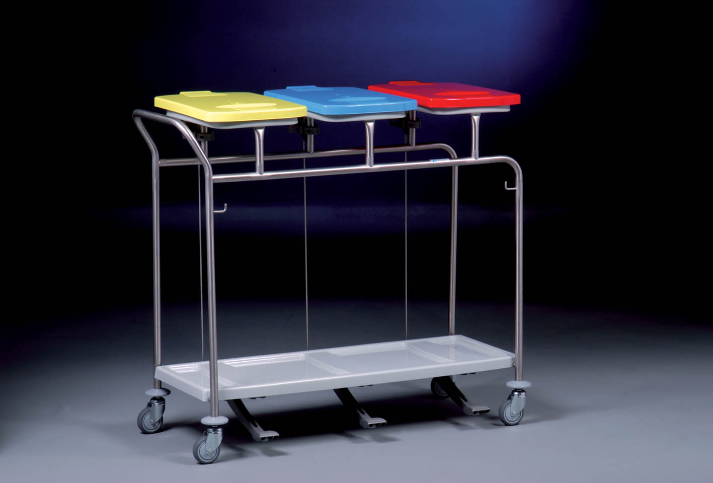 Potrójny zbieracz odpadów, z 3 opatentowanymi obręczami HR 2000 do zamocowania worków (obręcz wyposażona jest w kołnierz gumowy zawijany do góry, dzięki czemu worek nie zsuwa się z obręczy, aby zdjąć worek ze zbieracza wystarczy pociągnąć brzeg worka do dołu), z wytrzymałymi pokrywami wykonanymi z ABS, otwieranymi za pomocą mechanizmu pedału, dostępne kolory pokryw: biały, żółty, czerwony, zielony, niebieski, brązowy, szary, czarny, zbieracz wyposażony w wyjmowaną dolną półkę z ABS w kolorze jasnoszarym zabezpieczającą podłogi przed zabrudzeniem, konstrukcja zbieracza wykonana ze stali nierdzewnej, solidnie spawana, pozbawiona śrub i ostrych krawędzi, dodatkowy haczyk stalowy, 4 kółka obrotowe o średnicy 75 mm ze zderzakami w formie krążków, dostępne również inne kółka, wymiary: 1085 x 485 x 950 mm (szer./gł./wys.)