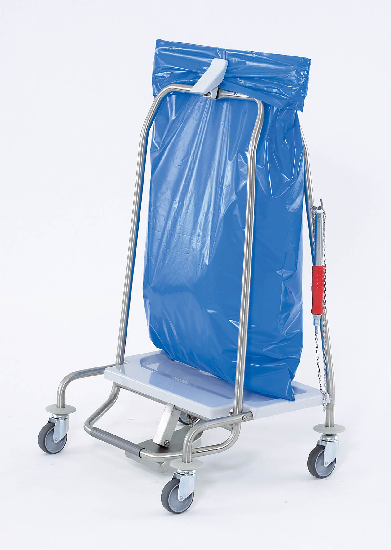Zbieracz odpadów Clappy, z gumowym kołnierzem o szer. 550 mm, na worki o pojemności ok. 70 l, z 2 klamrami przytrzymującymi worek, z dolną półką wykonaną z tworzywa ABS zabezpieczającą podłogi przed zabrudzeniem, z mechanizmem pedału i automatycznym hamulcem (naciśnięcie pedału powoduje zatrzymanie zbieracza), z aparatem do zamykania worków, stal nierdzewna, rama solidnie spawana, pozbawiona śrub i ostrych krawędzi, 4 kółka obrotowe o średnicy 75 mm (dostępne również inne kółka), 4 zderzaki w formie krążka, wymiary: 585 x 490 x 975 mm (szer. / gł. / wys.)