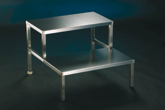 Podest operacyjny dwustopniowy, z wyciąganą ryflowaną płytą antypoślizgową, STAL NIERDZEWNA, materiał 1.4301, konstrukcja z rurki stalowej o przekroju kwadratu (25 x 25 mm), solidnie spawana, pozbawiona ostrych krawędzi, 2 nóżki z gumowymi, nie pozostawiającymi śladów nakładkami, z regulacją, 2 nóżki z antystatycznymi nakładkami z tworzywa, wymiary: 600 x 650 x 220 / 440 mm (szer./gł./wys.)