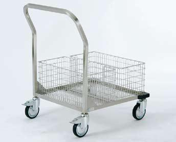 Wózek do transportu koszy do materiałów sterylnych STAL NIERDZEWNA, konstrukcja z rurki stalowej o przekroju kwadratu (25 × 25 mm), solidnie spawana, pozbawiona ostrych krawędzi. Przeznaczony do wygodnego transportu dwóch koszy 1 STE lub jednego kosza 2 STE, wyposażony w zderzaki narożnikowe. 4 antystatyczne kółka obrotowe (2 z blokadą), Ř 125 mm.