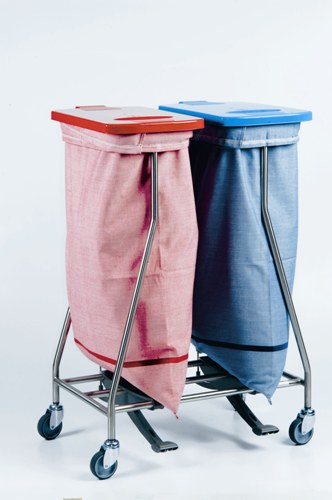 Podwójny zbieracz prania, z 2 opatentowanymi obręczami HR 2000 do zamocowania worków (obręcz wyposażona jest w kołnierz gumowy zawijany do góry, dzięki czemu worek nie zsuwa się z obręczy, aby zdjąć worek ze zbieracza wystarczy pociągnąć brzeg worka do dołu), z wytrzymałymi pokrywami wykonanymi z ABS, otwieranymi za pomocą mechanizmu pedału, z mechanizmem tłumienia hałasu przy zamykaniu pokrywy (mechanizm spowalniający opadanie pokrywy, dostępne kolory pokryw: biały, żółty, czerwony, zielony, niebieski, brązowy, szary, czarny, konstrukcja zbieracza wykonana ze stali nierdzewnej, solidnie spawana, pozbawiona śrub i ostrych krawędzi, 4 kółka obrotowe o średnicy 75 mm, dostępne również inne kółka, wymiary: 660 x 485 x 950 mm (szer./gł./wys.), dostępna również wyjmowana dolna półka z ABS w kolorze jasnoszarym zabezpieczająca podłogi przed zabrudzeniem