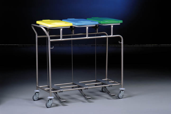 Potrójny zbieracz prania, z 3 opatentowanymi obręczami HR 2000 do zamocowania worków (obręcz wyposażona jest w kołnierz gumowy zawijany do góry, dzięki czemu worek nie zsuwa się z obręczy, aby zdjąć worek ze zbieracza wystarczy pociągnąć brzeg worka do dołu), z wytrzymałymi pokrywami wykonanymi z ABS, otwieranymi za pomocą mechanizmu pedału, dostępne kolory pokryw: biały, żółty, czerwony, zielony, niebieski, brązowy, szary, czarny, konstrukcja zbieracza wykonana ze stali nierdzewnej, solidnie spawana, pozbawiona śrub i ostrych krawędzi, dodatkowy haczyk stalowy, 4 kółka obrotowe o średnicy 75 mm ze zderzakami w formie krążków, dostępne również inne kółka, wymiary: 1085 x 495 x 950 mm (szer./gł./wys.), dostępna również wyjmowana dolna półka z ABS w kolorze jasnoszarym zabezpieczająca podłogi przed zabrudzeniem