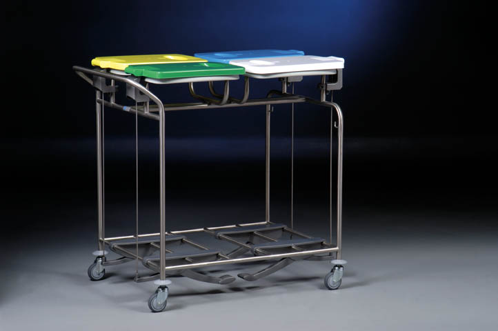 4-częściowy zbieracz prania, z 4 opatentowanymi obręczami HR 2000 do zamocowania worków (obręcz wyposażona jest w kołnierz gumowy zawijany do góry, dzięki czemu worek nie zsuwa się z obręczy, aby zdjąć worek ze zbieracza wystarczy pociągnąć brzeg worka do dołu), z wytrzymałymi pokrywami wykonanymi z ABS, otwieranymi za pomocą mechanizmu pedału, dostępne kolory pokryw: biały, żółty, czerwony, zielony, niebieski, brązowy, szary, czarny, konstrukcja zbieracza wykonana ze stali nierdzewnej, solidnie spawana, pozbawiona śrub i ostrych krawędzi, dodatkowy haczyk stalowy, 4 kółka obrotowe o średnicy 75 mm ze zderzakami w formie krążków, dostępne również inne kółka, wymiary: 970 x 700 x 950 mm (szer./gł./wys.), dostępna również wyjmowana dolna półka z ABS w kolorze jasnoszarym zabezpieczająca podłogi przed zabrudzeniem
