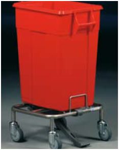 Pojedynczy stelaż jezdny z mechanizmem pedału, z 1 pojemnikiem na surowce wtórne, stelaż wykonany ze stali nierdzewnej, solidnie spawanej, 4 kółka obrotowe o średnicy 75 mm, wymiary: 400 x 500 x 720 mm (szer./ gł./ wys.), 1 pojemnik na surowce wtórne z pokrywą na zawiasie otwieraną za pomocą mechanizmu pedału, pojemność: 50 l, stabilne uchwyty, zagłębienia w dnie dla ułatwienia opróżniania, otwory do odpływu wody w krawędziach dna i uchwytach, materiał: Polipropylen, wymiary: ok. 305 x 445 x 515 mm, dostępne kolory: biały, zielony, niebieski, czerwony, żółty, brązowy, szary, czarny
