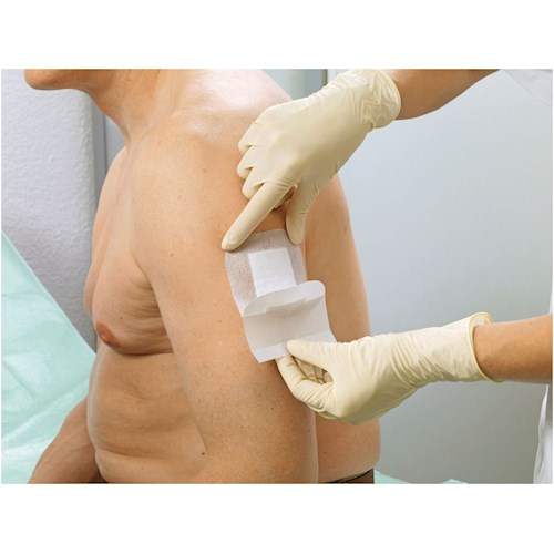 Samoprzylepny, 3-warstwowy opatrunek na rany i skaleczenia do skóry wrażliwej posiadający hydrofobową warstę kontaktową nieprzywierającą do rany.