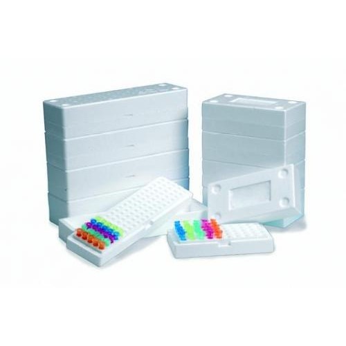 Niedrogie, lekkie, dwuczęściowe pojemniki ze spienionego polistyrenu (EPS). Doskonałe do przechowywania probówek o poj. 1,5 do 2,0 mL w zamrażarkach lub stosowania jako statywy. Powiększona odległość między dołkami umożliwia łatwą pracę. Pojemniki można bezpiecznie ułożyć w stos, dzięki odpowiedniemu wyprofilowaniu podstawy i pokrywy. Odporność termiczna od -80 do 70°C. Pojemników nie można sterylizować w autoklawie.