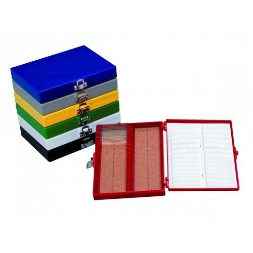 Pojemniki z tw. sztucznych z wykładziną korkową. Można je ustawiać w stos. Wersja 100-miejscowa ma niklowane zamknięcie, a 50-miejscowa – zwalniany kciukiem zatrzask z tworzywa. Do przechowywania i transportu szkiełek o standardowych wymiarach (76 x 26 mm). Miejsca na szkiełka są ponumerowane, opis można umieścić na kartce po wewnętrznej stronie pudełka. Kodowanie kolorami ułatwia identyfikację