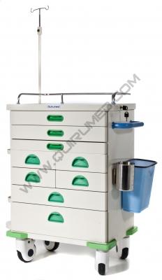 Asystor medyczny z szulfadami zamykanymi i stojakiem na kroplówkę.
