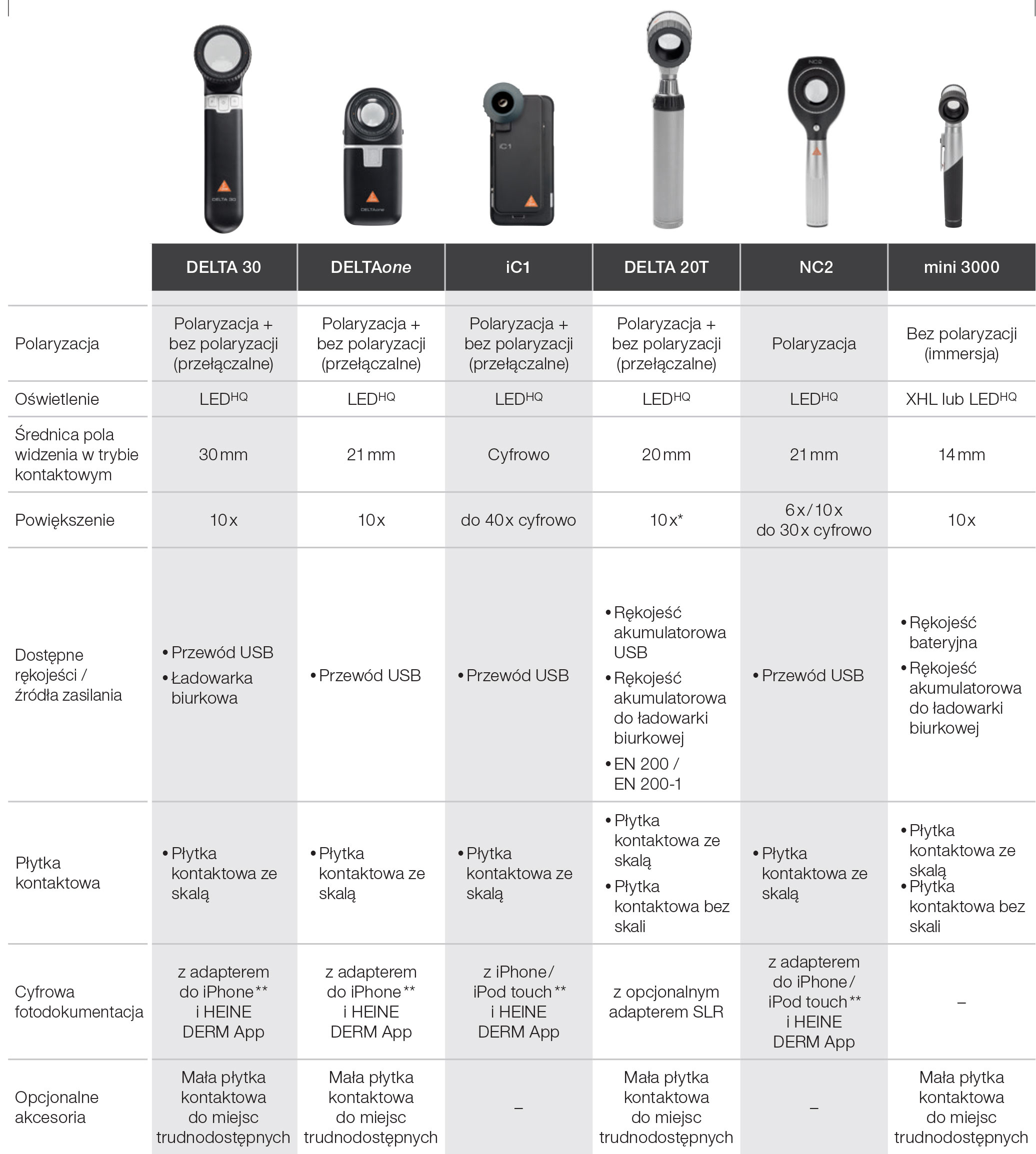 Dermatoskop diodowy DELTA 20 T służy do wykrywania strukturalnych zmian pigmentowych skóry, pozwalając m.in. na wczesne wykrycie czerniaka skóry. Jest bardzo precyzyjny co wynika z użycia soczewki achromatycznej, która powiększa obraz 10-16 razy, zachowując jego ostrość, unikając zniekształceń i dbając o bogactwo detali. Ostrość można regulować w zakresie -6/ +6 dioptrii. Oprócz świetnej optyki dermatoskop ten wyróżnia się innowacyjną technologią, dzięki zastosowaniu oświetlenia LED HQ, które oddaje kolory w możliwie jak najbardziej rzeczywisty sposób. Zawiera 4 diody LED: 2 diody do oświetlenia spolaryzowanego oraz 2 diody do oświetlenia niespolaryzowanego. Dermatoskop można połączyć poprzez adapterem z aparatem fotograficznym umożliwiając wykonywanie dokumentacji cyfrowej.