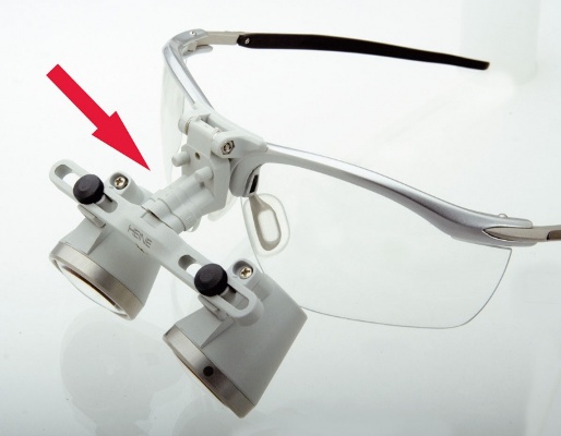 Łącznik kątowy HEINE umożliwia zmiane kąta pod którym lupa jest zamocowana do ramki. Uzyskanie odpowiedniego kąta widzenia, lub kąta odchylenia osi wzrokowych, jest bardzo ważne w zapobieganiu nadwyrężenia szyi i pleców spowodowanego nieprawidłową postawą podczas pracy.