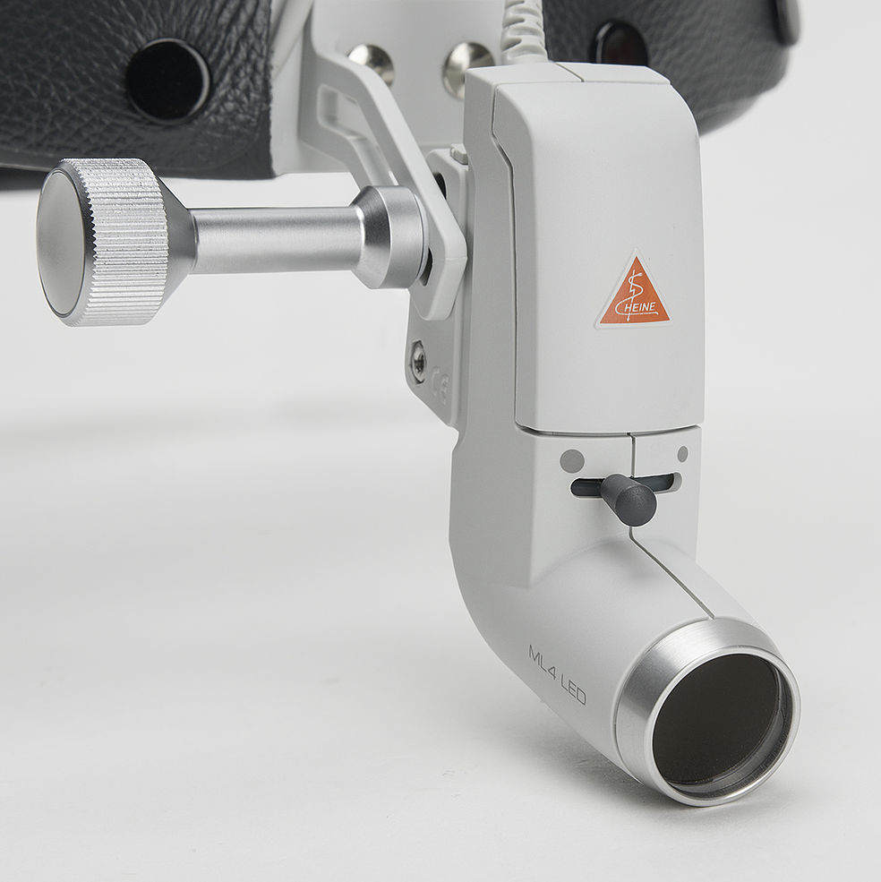 HEINE i-View – mocowanie lup: Zapewnia każdy kąt widzenia i umożliwia uniesienie optyki lupy niezależnie od ustawienia strumienia światła lampy czołowej ML4 LED HeadLight.