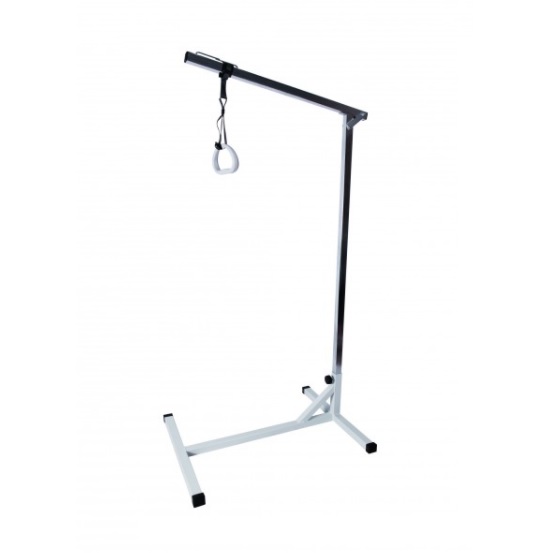 Uchwyt na wysięgniku posiada szary kolor podstawy i chromowany wysięgnik. Jest to pomoc dla osób leżących zarówno do celów ćwiczeń rehabilitacyjnych jak i dla zapewnienia pewnej samodzielności przy zmianie pozycji na łóżku przez pacjenta.