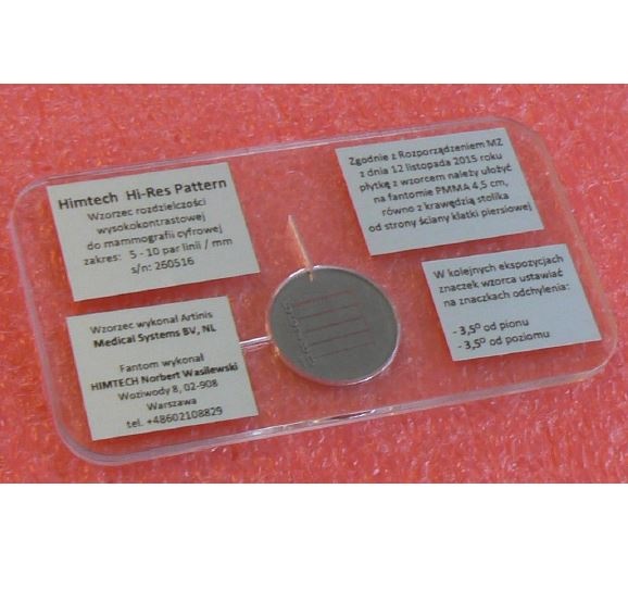 Wzorzec przeznaczony jest do wykonywania testów rozdzielczości w mammografii cyfrowej. Zgodnie z Rozporządzeniem Ministra Zdrowia z dnia 12 listopada 2015 roku takie testy należy wykonywać w cyfrowej mammografii pośredniej CR