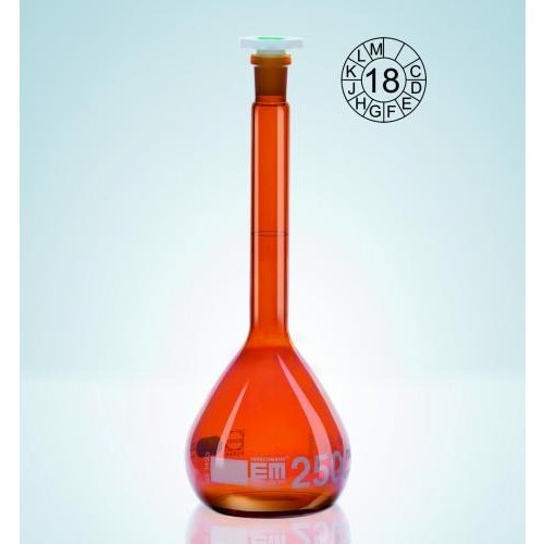 Szkło bursztynowe. Wzorcowane na wlew (TC, IN). Z naniesionym oznaczeniem serii i datą. Certyfikat zgodności wg DIN 12600. Ze szlifem NS i korkiem z tworzywa. Oznaczenia i podziałka wykonane trwałą, wysoce kontrastową, białą emalią, zgodnie z normą DIN EN ISO 1042. Raport kalibracji serii dostępny na stronie producenta www.hirschmannlab.com. Indywidualny certyfikat kalibracji lub certyfikat DAkkS (dawny DKD) dostępny na życzenie.