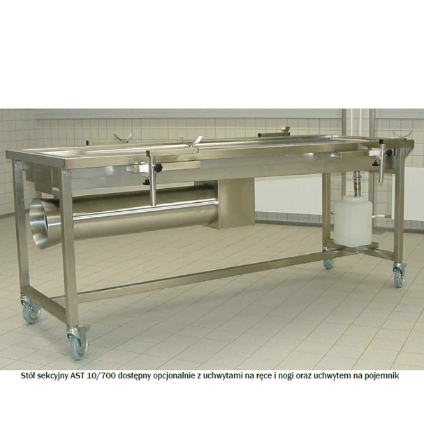 Stół sekcyjny z pochłaniaczem oparów służy do minimalizowania narażenia uczestników zajęć na formalinę. Jest wyposażony w łatwe do podłączenia złącze do systemu odprowadzania oparów, dostarczanego przez klienta. Stół jest w całości wykonany ze stali nierdzewnej (materiał nr 1.4301) z konstrukcją nośną wykonaną z wytrzymałych, odpornych na skręcanie profili oraz wyposażony w 4 sterowane koła, które można zablokować. W wąskim boku stołu znajduje się otwór, w który wsuwa się tacę na zwłoki.