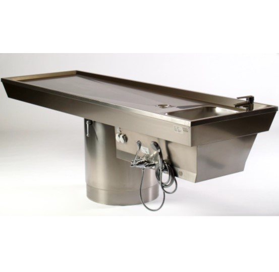 Stół do sekcji zwłok jest wykonany w całości ze stali nierdzewnej (materiał nr 1.43014301-ANSI 304304). Powierzchnia nośna jest wyposażona w krawędź o wysokim profilu obwodowym i bezszwowo zintegrowaną miskę na organy z zaworem stojącym i wkładką sitową.