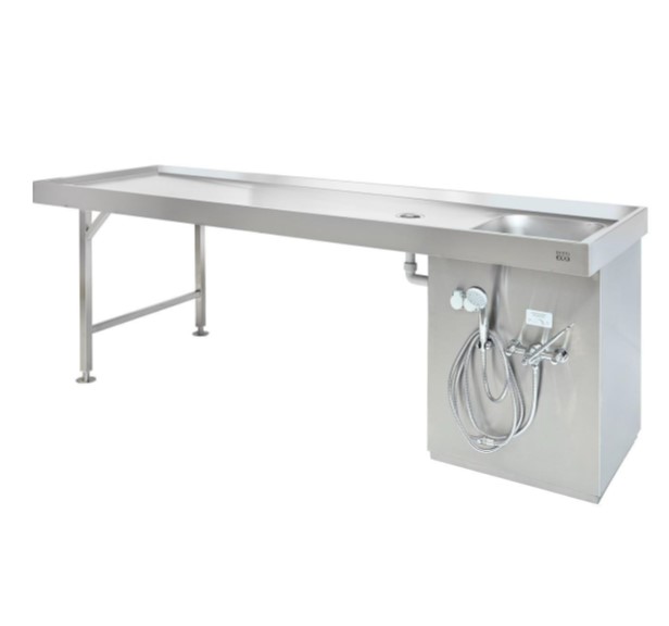 Stół jest ustawiony na kolumnie instalacyjnej i dwóch nogach o regulowanej wysokości, co pozwala zniwelować wszelkie nierówności. Stół sekcyjny jest w całości wykonany ze stali nierdzewnej (materiał nr 1.4301 - ANSI 304). Powierzchnia robocza posiada wysokie, profilowane obramowanie. Blat stołu ma spadek w kierunku odpływu. Odpływy powierzchni roboczej i umywalki są połączone w jedno połączenie odpływowe. Wszystkie połączenia zasilania są wbudowane w podstawę i można uzyskać do nich łatwy dostęp za pomocą otworu inspekcyjnego.
