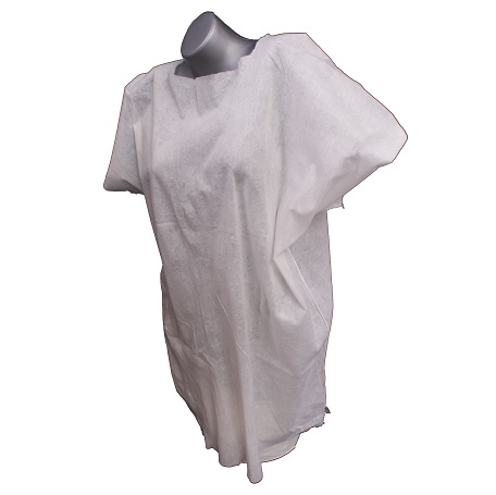 Fartuch medyczny dla pacjenta wykonany z miękkiej i przyjemnej w dotyku włókniny poliestrowo-wiskozowej o gramaturze min. 45g/m2, zapewniającej wygodę użytkowania oraz nieprzezierność. Krótki rękaw. Wycięcie na szyję w kształcie litery V. Z wycięciem w przedniej części związywanymi na troki.