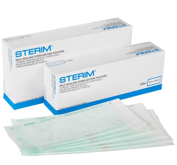 Jednorazowe opakowania w formie torebek płaskich, z paskiem służącym do ich zaklejenia, pozwalają na bezpieczną sterylizację oraz przechowywanie materiałów medycznych różnych rozmiarów, typów i przeznaczenia. Torebki samoklejące STERIM® składają są z dwóch warstw: papierowej i foliowej, połączonych 3-kanałowym termo zgrzewem, który cechuje się wyjątkową wytrzymałością oraz gwarantuje bezpieczne i łatwe, bezpyłowe otwieranie. Gramatura specjalnego papieru medycznego wynosi 70 g/m2 i została precyzyjnie dobrana zapewniając bardzo wysoką wytrzymałość na rozerwanie i przepuklenie. Powierzchnia foliowa koloru zielonego wykonana jest z nowego 6-warstwowego MULTI kompozytu poliestru, kleju i polipropylenu o grubości 52µm. Ulepszony kompozyt foliowy posiada właściwości zapewniające wysoką jakość zgrzewu z powierzchnią papierową oraz dużą elastyczność i trwałość. Na torebkach papierowo-foliowych nadrukowane są wskaźniki chemiczne klasy 1 sterylizacji STEAM, EO i FORM. Podstawowe informacje techniczne wymagane przez normy umieszczone są w czterech językach: polskim, angielskim, niemieckim i rosyjskim. Wszystkie napisy, wskaźniki oraz informacja o kierunku otwierania zostały umieszczone na linii zgrzewu fabrycznego pod folią, aby wyeliminować ryzyko skażenia tuszem lub zabrudzenia rozmytym wskaźnikiem. Dodatkowo umieszczone informacje o kolorze wskaźników przed i po procesie sterylizacji mają ułatwić personelowi rozróżnienie pakietów sterylizowanych od niesterylizowanych. Opakowania zamykane są bezpiecznie dzięki zastosowaniu paska klejącego na krawędzi torebki. Torebki zapakowane są po 200szt. w kartony, na których umieszczone są m. in. informacje o numerze serii, dacie produkcji i przydatności oraz znak CE.