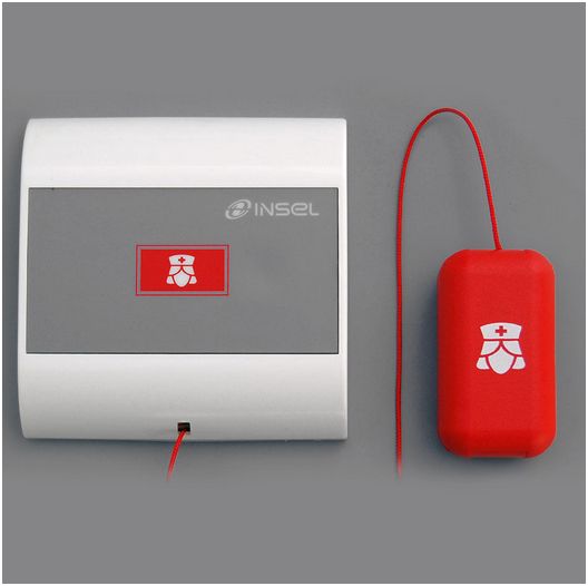 Włącznik łazienkowy pociągany. Umożliwia załączenie sygnału alarmowego przez pociągnięcie za sznurek zakończony obciążeniem z piktogramem pielęgniarki.