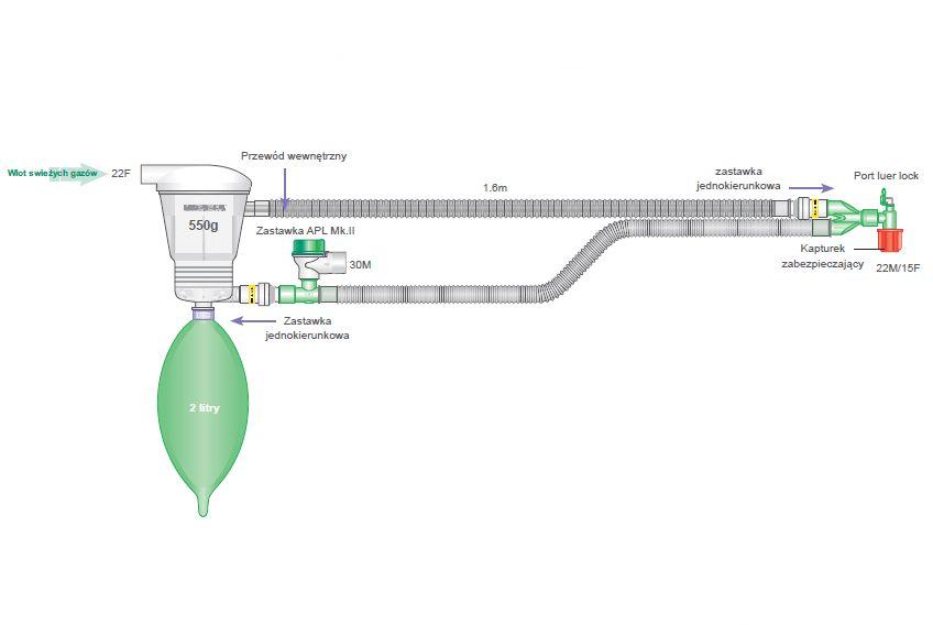 Układ oddechowy z przewodem wewnętrznym do bezpośredniej podaży gazów pacjentowi, umożliwiającym szybkie zmiany stężeń środków anestycznych.
