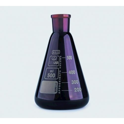 Szkło borokrzemianowe 3.3. Bursztynowe. Wysoka odporność termiczna i chemiczna. Spełniają wymagania normy DIN EN ISO 4797. Szyjka z gwintem NS zgodna z normą DIN 12242. Oznaczenia wykonane białą emalią.