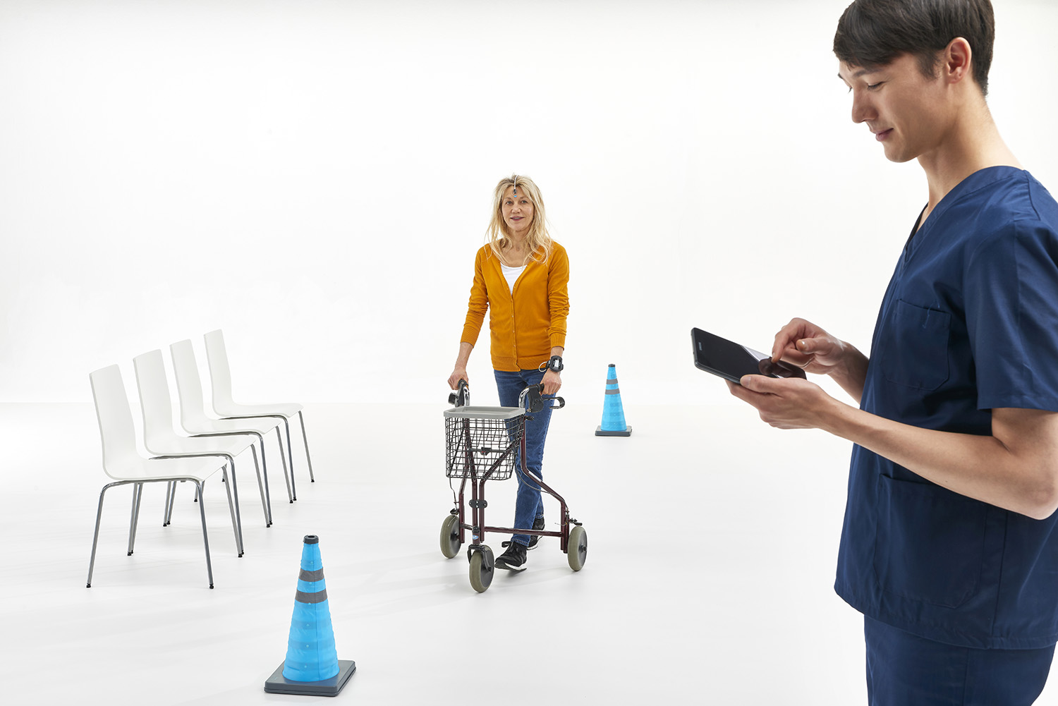 Dzięki lekkiej konstrukcji i bezprzewodowej komunikacji z pulsoksymetrem Bluetooth®, pacjent może swobodnie poruszać się po wyznaczonym torze, bez ograniczeń przewodami. System współpracuje z wygodnymi czujnikami SpO₂ – zakładanymi na palec, ucho lub czoło – co zapewnia elastyczność w zależności od potrzeb klinicznych i komfortu pacjenta.