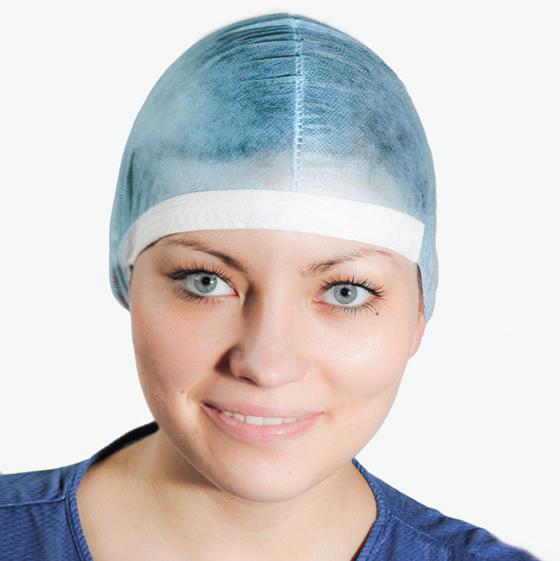 Włókninowy czepek chirurgiczny o kroju furażerki, ze wstawką pochłaniającą pot (wstawka wykonana jest z białej chłonnej włókniny) ściągnięty delikatną, nie uciskającą, bezlateksową gumką. Pakowany w kartonik w formie podajnika. Kolor niebieski. Ilość sztuk w opakowaniu "podajnik"/Ilość sztuk w opakowaniu transportowym: 50/500.