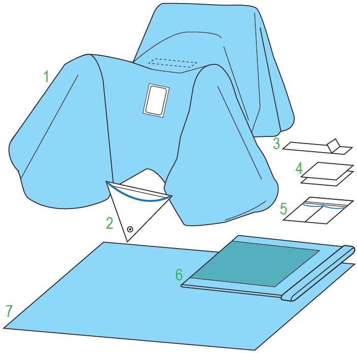 OBŁOŻENIE PERINEUM 150/2ST. Elementy zestawu: serweta chirurgiczna do zabiegów ginekologicznych dolnych o wymiarach 240/150x150 cm zintegrowana z nogawicami, posiada otwór samoprzylepny o wymiarach 10x15 cm w okolicach krocza 240/150x150 cm - 1 sztuka; torba samoprzylepna do przechwytywania płynów ze sztywnikiem 60x60 cm - 1 sztuka; taśma samoprzylepna 9x49 cm - 1 sztuka; ręczniki chłonne 30x40 cm - 2 sztuki; kieszeń dwukomorowa samoprzylepna ze sztywnikiem 2x15x40 cm - 1 sztuka; osłona na stolik MAYO 79x145 - 1 sztuka; serweta na stolik (owinięcie zestawu) 150x200 cm - 1 sztuka. Zestaw sterylny. Ilość sztuk w opakowaniu "podajnik": 5.