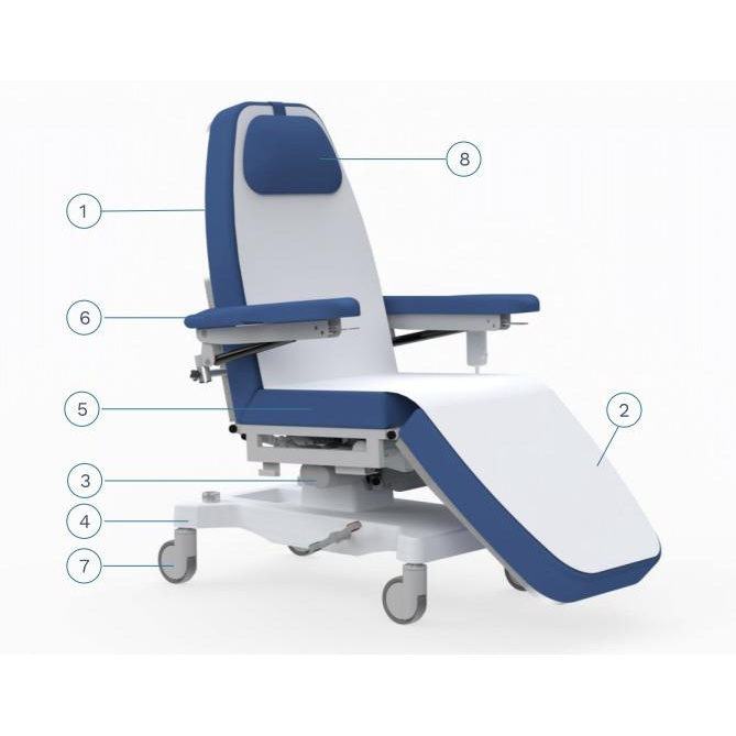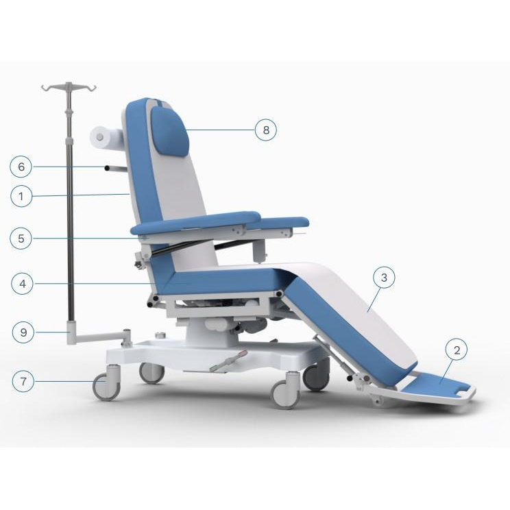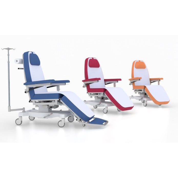 Wielozadaniowe fotele do pobierania krwi i dializ Alpha. Konstrukcja fotele składa się z 3 części, które są niezależnie regulowane za pomocą silników elektrycznych. Fotel posiada pilot sterowania ręcznego. Dodatkowo jest możliwość wyposażenia w awaryjny przycisk bezpieczeństwa oraz panel nadzorczy. Dla wygody korzystania możliwość zamontowania portu USB, pojemnika na dokumenty, uchwytu na rolkę i lampkę nocną.