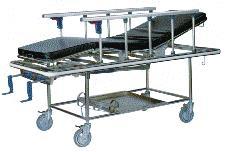 Wózek do przewożenia chorych 2 korbowy.Rama ze stali nierdzewnej 304, kółka blokowane i kierunkowe 155 mm, możliwość dołączenia stojaka na płyny infuzyjne, materac z gęstej pianki pokryty sztucznym tworzywem. Kąt uniesienia segmentu uda: 40 stopni.