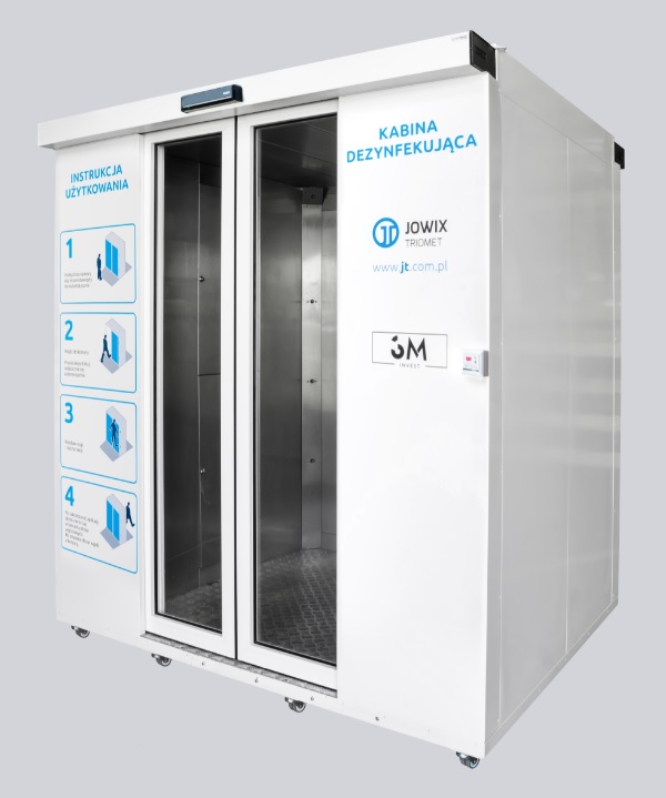 Śluza dezynfekcyjna firmy JOWIX TRIOMET może być zamontowana w każdym miejscu. Zarówno na zewnątrz budynku jak i w środku. Śluza jest w pełni mobilna. Osoby korzystające ze śluzy są poddawane procesowi dezynfekcji w bardzo krótkim okresie czasu poprzez zamgławianie z dysz wewnątrz śluzy. Śluza działa automatycznie i jest aktywowana , w chwili wykrycia przez fotokomórkę ruchu przed drzwiami. Drzwi otwierają się automatycznie. Preparat dezynfekujący silverspet total jest zasysany ze zbiornika wbudowanego do śluzy oraz podawany pod odpowiednim ciśnieniem do 16 dysz które zamgławiają jej wnętrze. Po zakończeniu zamgławiania drzwi otwierają się automatycznie. Dla bezpieczeństwa z chwilą zaniku prądu drzwi w śluzie otwierają się automatycznie. Dodatkowo wewnątrz i na zewnątrz śluzy zamontowano przyciski pozwalające na otwarcie drzwi w każdej chwili. Śluza przystosowana jest do korzystania dla osób niepełnosprawnych