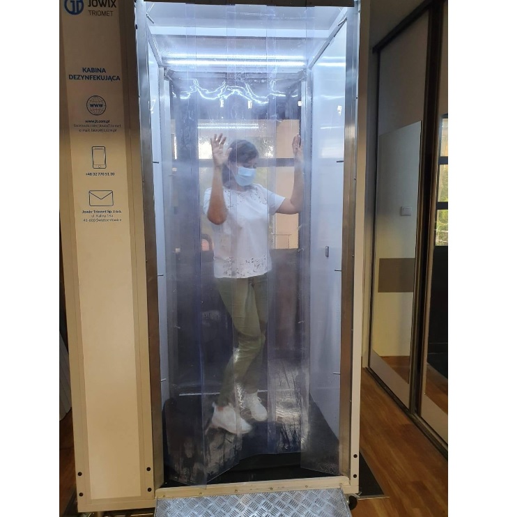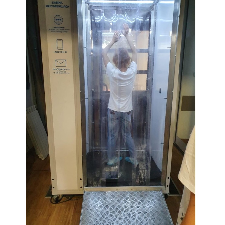 Mobilna, kabina dezynfekcyjna z kurtyną z folii do stosowania w miejscach użyteczności publicznej, szpitalach, biurowcach, ,galeriach handlowych, kopalniach, halach produkcyjnych i targowych, lotniskach, hotelach do zwalczania wszelkiego rodzaju wirusów odmiany COVID-19, POLIO, PTASIA GRYPA, ASF, bakterii niszczących grzyby, drożdże i pleśnie. Urządzenie jest wykonane z najwyższą starannością z wykorzystaniem wysokiej jakości materiałów. Zastosowano w nim nowoczesne rozwiązania dla bezpieczeństwa ludności, z bezdotykową detekcją osób, zakresem dezynfekcji 360 o . Dedykowany preparat do dezynfekcji SILVERSEPT TOTAL jest nieszkodliwego dla ludzi i zwierząt gwarantuje pełną dezynfekcję ludzi i sprzętu.