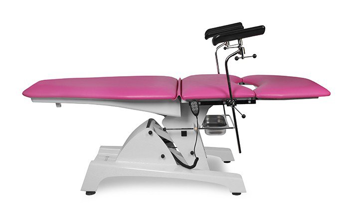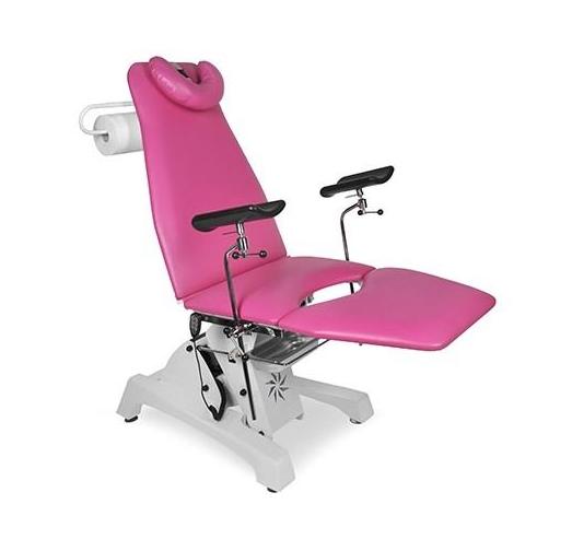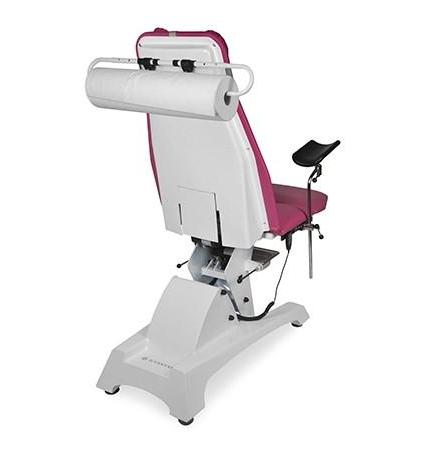 Konstrukcja wykonana z pokrytych farbą proszkową profili stalowych. Fotel sterowany elektrycznie, dzięki czemu wysokość fotela i kąt nachylenia oparcia możemy regulować pilotem elektrycznym. Fotel ma zapewnić pełen komfort i wygodę zarówno dla pacjentów, jak i lekarzy. Składa się z regulowanego oparcia, wygodnego podgłówka i regulowanych na wszystkich płaszczyznach podkolannikach. Posiada też demontowany podnóżek. W standardzie jest również pojemnik nierdzewnej stali. Blat wykonany jest z doskonałego materiału skóropodobnego, dostępnego w szerokiej gamie kolorystycznej. Fotel umożliwia uzyskanie pozycji leżącej, Trendelenburga i anty-Trendelenburga.