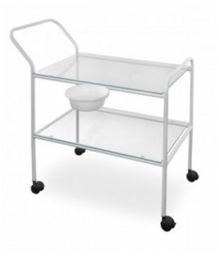 Stolik zabiegowy do przewozu na niedalekie odległości narzędzi, materiałów sterylnych, leków i innych przyrządów w szpitalach, laboratoriach oraz w gabinetach zabiegowych. Stolik wykonany ze stali pokrytej lakierem proszkowym. Osadzony jest na kółkach jezdnych z hamulcem. Posiada 2 szklane pólki oraz miskę wykonaną z tworzywa.