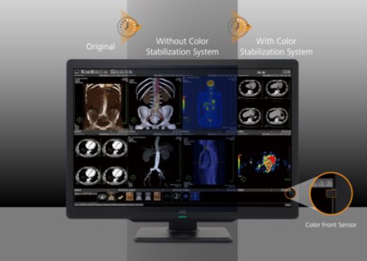 - Stabilny kolor. System stabilizacji może automatycznie dostosowywać luminancję i temperaturę barwową w czasie rzeczywistym. Wbudowany czujnik przedni koloru znajdujący się przed ekranem, dokonuje ciągłego pomiaru temperatury barwowej i koryguje jej ewentualne zmiany w czasie wynikające z długotrwałego użytkowania. Stałe monitorowanie parametrów koloru jest możliwe, ponieważ czujnik jest umieszczony na stałe przed ekranem. Funkcjonalności tej nie może zapewnić ruchomy czujnik zewnętrzny.