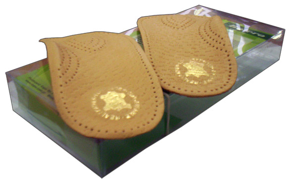 Wkładki skórzane na płaskostopie poprzeczne i podłużne Bolero – wkładki do butów, podpiętki, peloty, kliny. ZASOSOWANIE: wkładki na płaskostopie poprzeczne zapobiegają opadaniu sklepienia podłużnego oraz poprzecznego stopy; mają za zadanie podpierania sklepienia podłużnego stopy; dzięki zastosowaniu peloty korzystnie zmieniają rozkład nacisków na podeszwowej stronie przedniej części stopy. WŁAŚIWOŚCI: wkładki na płaskostopie poprzeczne i podłużne pełnią funkcję amortyzatora; znacząco redukują mikrowstrząsy powstające w czasie zetknięcia się pięty z twardym podłożem; wkładki zostały wykonane z profilowanego tworzywa; wykonane z naturalnej skóry owczej pochłaniającej pot stóp; szczególnie zalecane są osobom wykonywującym pracę stojącą lub chodzącą.
