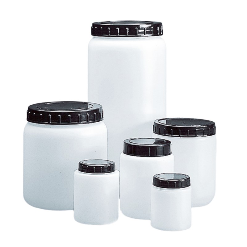 Pojemniki wyposażone w dekiel i pokrywę gwintowaną. Bardzo szeroka szyja powoduje, że nadaje się doskonale do przechowywania materiałów o konsystencji stałej i proszków.