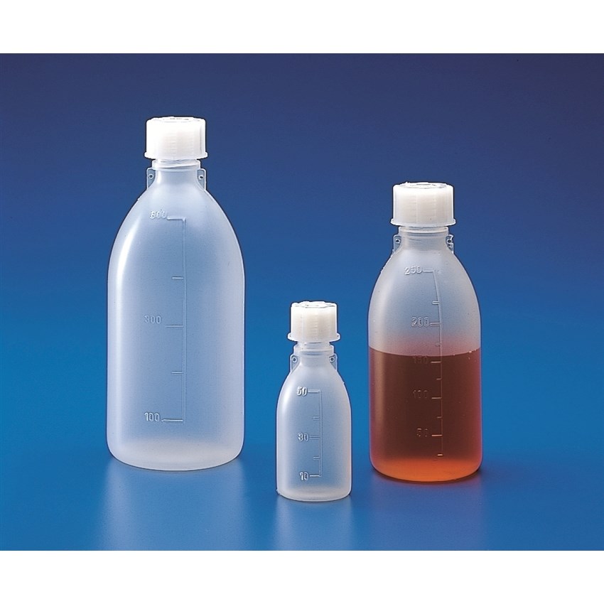 Butelka PP z wąską szyjką, podziałką i nakrętką. Butelka z grubymi ściankami, idealnie nadaje się do transportu skażonej wody i innych laboratoryjnych próbek. Nakrętka zapobiega zanieczyszczeniu próbki. Zgodna z DIN 13316 oraz 168. Autoklaowalna (oprócz nakrętki). Nadaje się do kontaktu z żywnością.