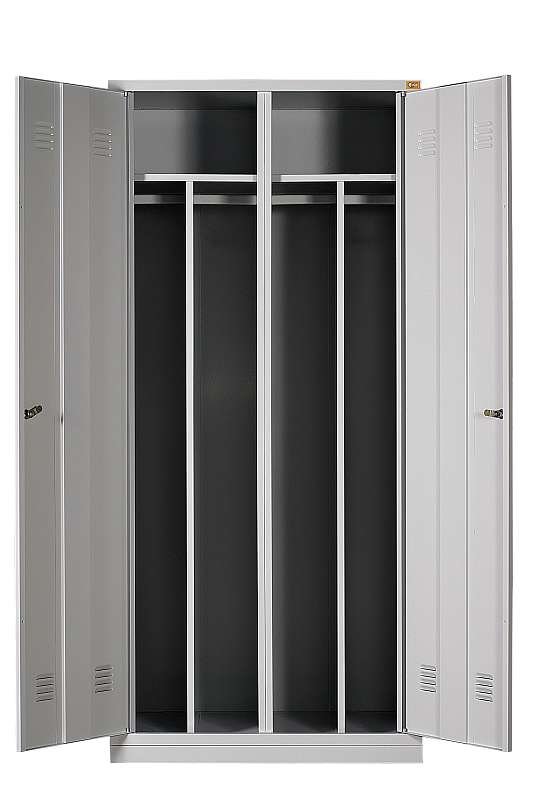 Dwudrzwiowa szafa ubraniowa wyposażona jest w półkę, wieszaki boczne oraz drążek na wieszaki ubraniowe. Każda komora posiada podział wewnętrzny (czyste/ brudne). Wykonana jest z blachy czarnej o grubości 0.6mm-1.0mm, malowana farbami proszkowymi (epoksydowo- poliestrowymi). Zamykana zamkiem krzywkowym w systemie MASTER KEY. Całość osadzona na cokole wykonanym z blachy ocynkowanej (malowanej) o grubości 1.0mm.