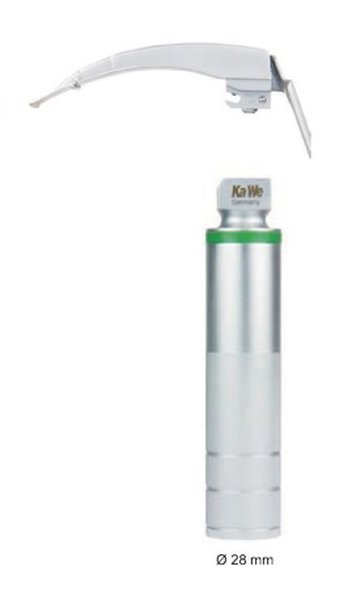 Laryngoskop KaWe w formie kompletu: rękojeść 03.41140.711 + łyżka laryngoskopowa ECONOMY MACINTOSH F.O. Rękojeść 03.41140.711: kompatybilna z łyżkami spełniającymi normy DIN ISO 7376, mała, światło LED 3,5 V. Łyżka laryngoskopowa FLAPLIGHT F.O. MEGALIGHT: oświetlenie światłowodowe o przekroju 3x7 mm; dostępne rozmiary: 2, 3, 4, wbudowane światłowody.